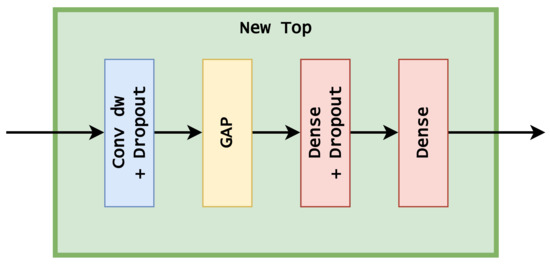 The new top scheme for the architectures includes four layers: a depth-wise convolution with dropout (Conv dw + Dropout), a global average pooling (GAP), a dense layer with dropout, and a dense layer as the final output of the network. This proposed new top for the networks can be observed in Figure 8.