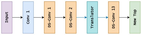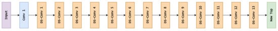 Figure 9 shows the base architecture for the MobileNet [37]. Each depth-wise separable convolution (DS-Conv) block is represented by an orange rectangle, which summarizes both convolutions with their respective batch-norm and activation function.