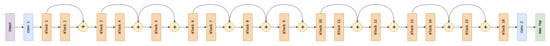 Figure 10 shows the base architecture for the MobileNetV2 [38]. As it can be observed, the inverted bottlenecks are represented with orange rectangles as entire blocks. Furthermore, the adder layers are represented by yellow rectangles.