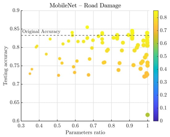 Figure 28 and Figure 29 shows that, as in the previous experiment, the MobileNetV2 is a robust feature extractor. Furthermore, Table 11 shows that in this experiment, a compression of around 80% is achieved again, besides reaching accuracy levels close to or even better than the originally reported by the base model.