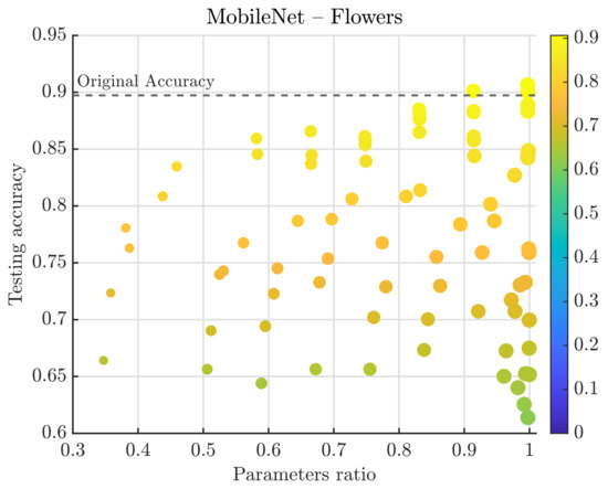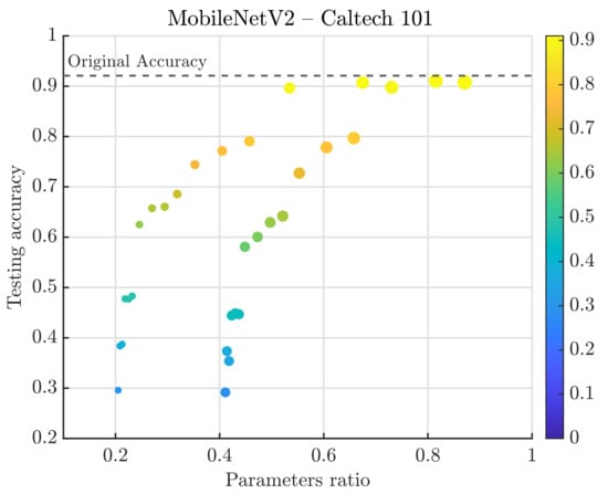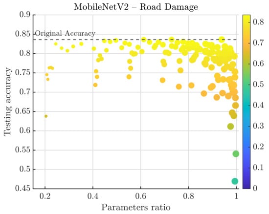 As it can be seen in Table 10, the MobileNetV2 shows excellent performance as a feature extractor such as the MobileNet in the previous experiments. Furthermore, one of the top-accuracy sub-models achieves a remarkable parameters reduction, and their accuracy is barely different from the original. To visualize the network compression, this sub-model is displayed in Figure 26.