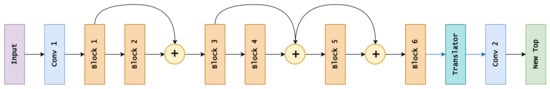 The pruned layers left sub-structures that must be reconnected; therefore, to reconnect the remaining layers a new block called translator is introduced, which can be observed in Figure 3.