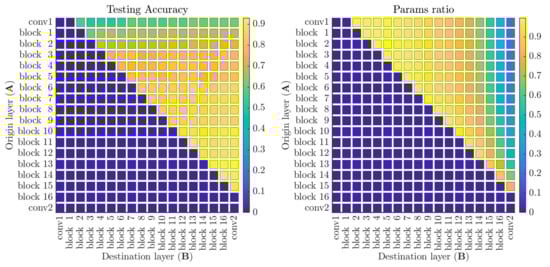 Table 11 presents the performance and information of the top five generated sub-models, selected according to their accuracy reached and params ratio. Once more, the models are named using the first part of the name as the origin layer, and the second part of the name refers to the destination layer of the pruning.