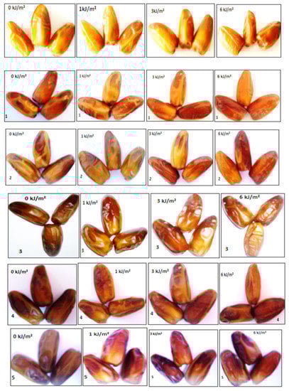 In general, and from research studies that realized fruits and vegetables using UV-C radiation, results are encouraging, since quality was altered but improved in in most cases. Indeed, astudy conducted by Hosseini et al. [55] showed the effectiveness of low UV-C to preserve the physicochemical and sensory parameter of pistachio. Furthermore, low doses are sufficient for some fruits and vegetables, and indeed these researchers noted that the dose of 2.1 kJ m−2 was more active than 4.5 kJ m−2, and pistachio were in this case lighter, redder and less yellow than the highest tested dose.