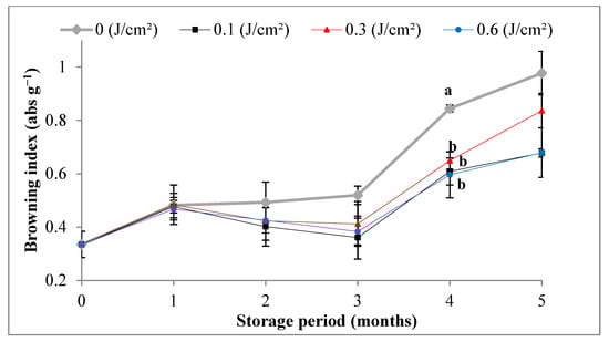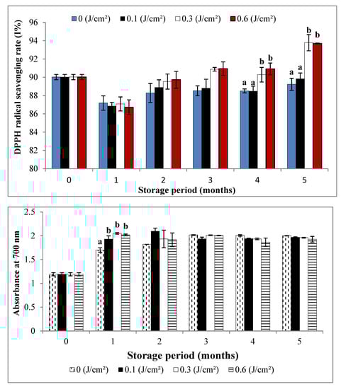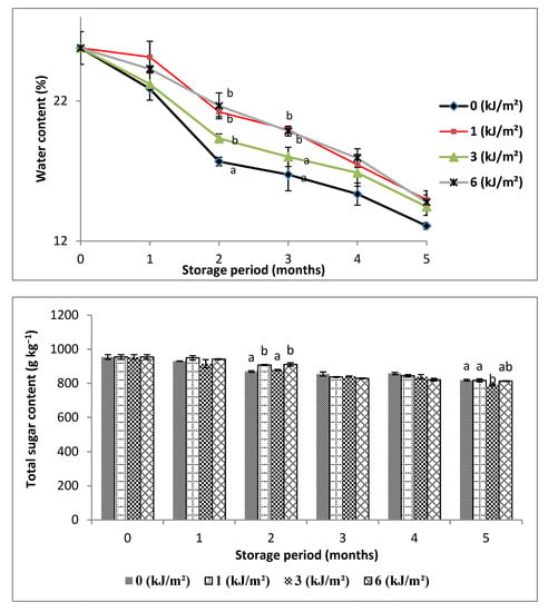 Until the second month, the slowing down of sugar consumption was significantly favored in the samples irradiated at 1 and 6 kJ m−2, which was marked by decreases of 4.98% and 4.57% versus 8.96% in the control.