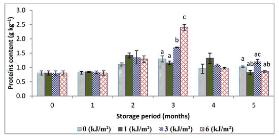 Analysis of the results shows that there is an increase in the total protein levels during storage compared to the control. This increase in protein content is more marked in the case of the irradiated sample at 6 kJ m−2 in the third month of storage. Indeed, samples of 3 and 6 kJ·m−2 gave 1.70 and 2.41 g·kg−1 versus 1.29 g kg−1 of the control. The increase may be due to the activation of biosynthesis of enzymes involved in synthesis of defense molecules against stress caused by UV-C. Most likely, the increase is concomitant with the slowing down of protein degradation, in particular by inhibition of the action of proteases, which is associated with the ripening and senescence of fruit, as has been reported in many works [23]. Therefore, it appears that the degree of slowing of protein decomposition is higher in the irradiated samples than in the control.