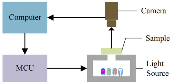 As shown in Figure 1, the experimental system is composed of LED transmission light source with 4 wavelengths (381 nm, 439 nm, 620 nm and white), transmission spectrum acquisition camera (DFK23GPO31, The Imaging Source Inc., Bremen, Germany), microcontroller control unit (MCU) and data processing unit (Computer). The 381 nm, 439 nm, 620 nm and white wavelengths of the LED transmission light source were selected from the existing wavelengths of 381 nm, 439 nm, 495 nm, 520 nm, 620 nm and white by the experiment based on the comprehensive consideration of recognition effect and data size. The LEDs of the 4 wavelengths successively irradiate the transparent plastic on one side, and the corresponding transmission spectrum is obtained by the camera that is located on the other side of the plastic. The obtained spectra are then processed by a computer for color recognition.