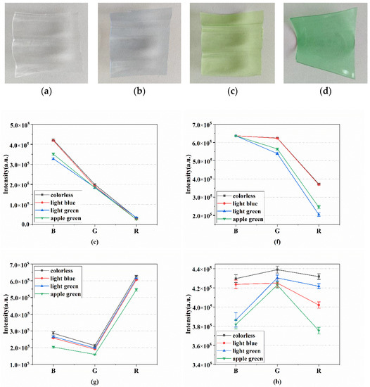 The colorless (a), light blue (b), light green (c) and apple green (d) transparent plastic used in the experiment and the transmission spectra of the transparent plastics at transmission light sources of 381 nm (e), 439 nm (f), 620 nm (g) and white (h).