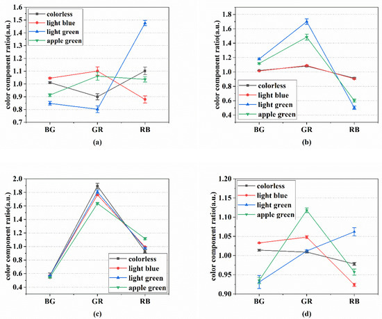 The mean values of the color parameters BG, GR and RB of the colorless, light blue, light green and apple green plastic at 381 nm (a), 439 nm (b), 620 nm (c) and white (d) transmission light sources.