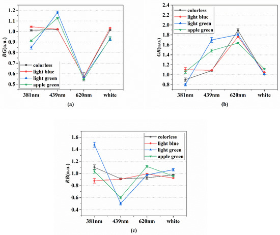 For each sample, the color parameters BG, GR and RB were calculated from the transmission spectra that were obtained at the 381 nm, 439 nm, 620 nm and white transmission light sources. As described in Section 2.2, for each color of plastic, there were 40 samples, thus there were 40 sets of color parameters BG, GR and RB at each wavelength of transmission light source. The mean values of the 40 sets of color parameters were, respectively, calculated for each color of plastic at each wavelength of transmission light source, as shown in Table 1 and Figure 3.