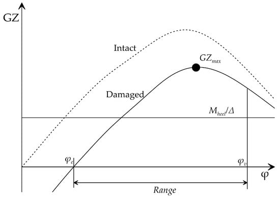 where GZmax is the maximum of the residual righting lever curve for each damage case and loading condition. GZmax must fall within the positive interval Range between the equilibrium angle φe and φv, the minimum between the capsize and the unprotected opening immersion angle. TRange and TGZmax assume different values for cases involving flooding of car deck in Ro-pax ships (0.20 m for TGZmax, 20° for TRange) and not (0.12 m for TGZmax, 16° for TRange). Δ is the ship displacement and Mheel is the external moment, which is the maximum between moments due to wind, movement of passengers and launch of survival crafts. The s-factor formulations in Equations (4)–(6) are all with values in [0, 1], thus the s-factors represent a probability to survive a specific event in a specific flooding condition. Figure 1 shows an example of a residual GZ curve with the associated parameters relevant for stability assessment.