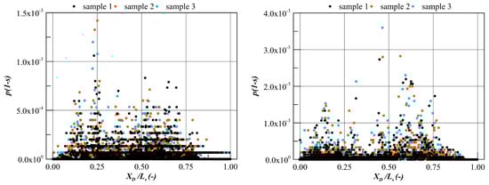 The static survivability assessment is performed on the damage cases derived from the sampling of marginal distributions, grouped in unique damage scenarios with associated p-factors, and determining the associated survivability through Equations (4)–(6). As already mentioned, each damage case has an occurrence pijk and a probability to survive that damage case defined by sijk. These two factors can be representative of risk. The factor pijk (1 − sijk) can be used to give a rough estimate of the capsize risk associated with a particular damage case. Figure 2 gives an example for two different passenger ships (one cruise ship and one Ro-pax), considering the collision damage cases resulting from three repetitions of 105 breaches. The Figure shows the damages as they are located along the ship length, reporting the non-dimensional location of the damage centre XD/Ls. The diagram highlights the areas having higher risk of capsize due to flooding, thus the area where designers should focus to improve ship safety. The static risk profile gives useful information to compare potential risk of different ships or design solutions; however, it is not enough to have an effective and realistic vision of the flooding process in the most critical cases.