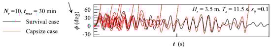 The function I in Equation (9) is not only influenced by the number of repetitions of each dynamic simulation, but also by the exposure time in the wave environment; thus, by the maximum simulation time tmax used for the simulations. Here, simulations were carried out setting tmax to 30 min as it is usual for probabilistic assessment of passenger ship survivability. However, not all capsize cases have the same nature and this should be investigated in detail.