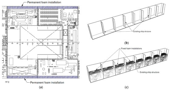 AREST P1 system; (a) permanent foam installation sites (blue) in a double hull. (b) Existing ship structures in the installation site. (c) Void spaces filled with foam.