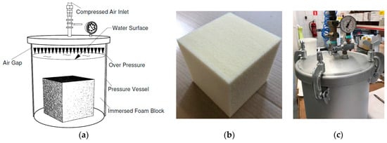 Overpressure water absorption test. (a) Test settings, (b) foam specimen, (c) pressure vessel.