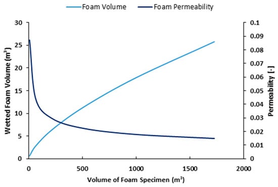 With respect to the above-mentioned results outlined within the foregoing, it is important to consider the effects of scale and their impact on the permeability value calculated. The sample sizes used within the experiments are of the order of 0.001 m3 in comparison to the static foam installations, which are of the order of 200–300 m3 in size. This is important, as the manner in which the foam absorbs water is such that smaller sample sizes will demonstrate higher permeability than large ones. Consequently, the experiments are inherently conservative due to the scale at which they are conducted. This means that the wetted volume of foam relative to the specimen size will decrease with increasing foam volume.