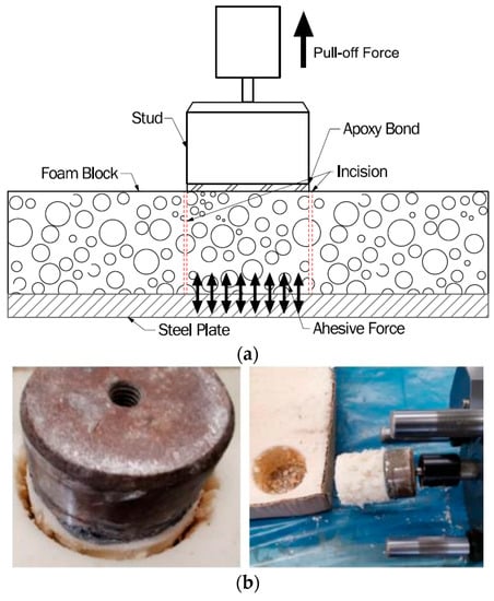 Pull off test; (a) test diagram. (b) Stud fixed to foam/plate assembly (left); foam separated from steel plate (right).