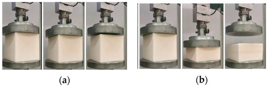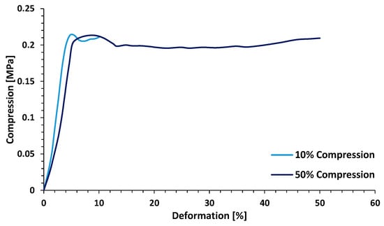In determining the foam compressive strength characteristics, two experiments were conducted on a foam specimen of 100 × 100 × 50 mm in size. In each case, the foam samples were placed within a compression-testing machine where they underwent 10% and 50% deformation, respectively. Figure 9 shows the tests for both deformations.