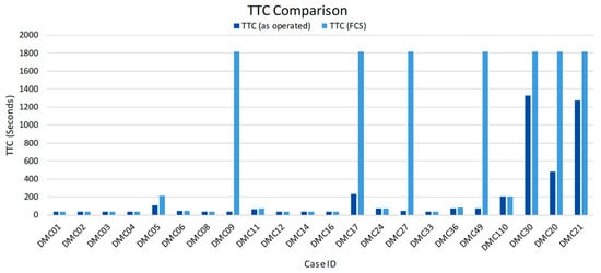The results produced for the vessel in the original configuration have highlighted 22 capsize cases (3 progressive flooding cases/19 transient capsize cases), which translates to a survivability index of 0.987, applying Equation (8). The results of simulations with AREST P1 demonstrated a reduction in capsize cases from 22 to 15; all the cases are transient capsizes. Figure 19 shows the location of the residual loss scenarios for the two configurations; the differences in the time to capsize for the same damage cases are reported in Figure 20. Based on the updated results, the vessel survivability index for 30 min of exposure time increased from 0.987 to 0.992.