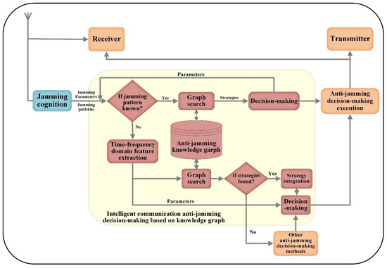 The intelligent communication anti-jamming decision-making module knowledge graph makes its anti-jamming decision following two different procedures: (1) if the jamming pattern is known, then the decision-making module will decide anti-jamming strategies by directly searching its knowledge graph based on the known jamming pattern and related parameters; (2) if the jamming pattern is unknown, then firstly the time-frequency domain features of unknown jamming pattern and its parameters need to be extracted, then the decision-making module will search its knowledge graph based on the acquired jamming pattern and its parameters for suitable anti-jamming strategies.