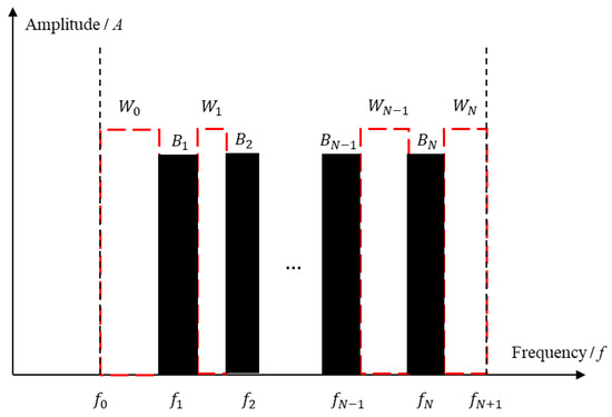 We assume that the communication signal occupies the frequency range between and , and its bandwidth is . Additionally, the effective jamming signal shares the same frequency band with the communication signal, which is composed of single-frequency narrowband signals. At time , the central frequencies of all the jamming signals falling in the frequency range of are , , …, , respectively, and their bandwidths are , respectively. Frequency domain representations of the jamming signals are shown in Figure 3.