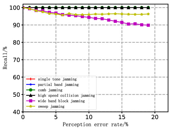 Related parameters used in our simulations are set as follows: the available communication frequency band is set to be 30 MHz~2.5 GHz, namely the communication bandwidth 5 MHz. The starting and stopping frequency range of the jamming pattern is set to be 30 MHz~2.5 GHz; the bandwidth of partial frequency band jamming and multi-tone jamming range is set to be 500 kHz~300 MHz; the instantaneous bandwidth of high-speed collision jamming and sweep jamming range is set to be 500 kHz~300 MHz. Perception error rate is the ratio of the perceived frequency deviation to the true value from the jamming sensing module. The simulation results are shown in Figure 4.