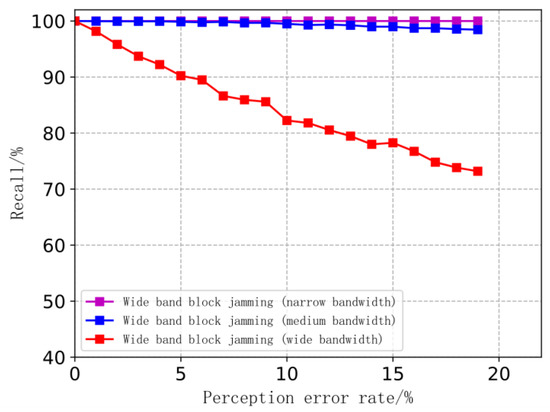 The simulation result shows that the recall of frequency domain feature extraction is higher when the jamming pattern is narrowband or instantaneous narrowband. It is also proved that the proposed feature extraction method has strong robustness against perception error. Our analysis suggests that when the bandwidth of the jamming signal is relatively narrow compared with the communication frequency band, the jamming cannot cover the available frequency band, and the jamming parameters perceived under a certain error cannot cover the available frequency band. Thus, the original frequency domain features are still maintained, and the feature extraction algorithm can recognize and extract in this case. Compared with narrowband or instantaneous narrowband jamming patterns, the recall of frequency domain feature extraction of wideband block jamming patterns decreases slowly with growing perception error because the bandwidth of the jamming signal is relatively wider than the communication frequency band, which is consistent with our analysis. It is indicated that the proposed frequency domain feature extraction method has the ability to effectively extract jamming features.