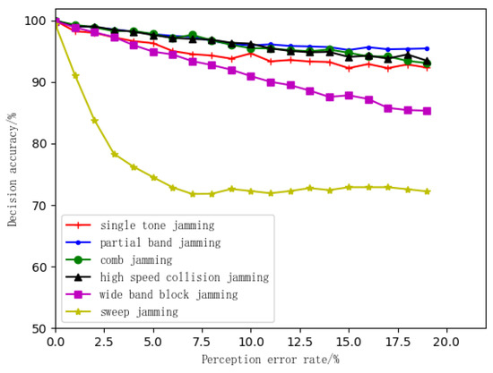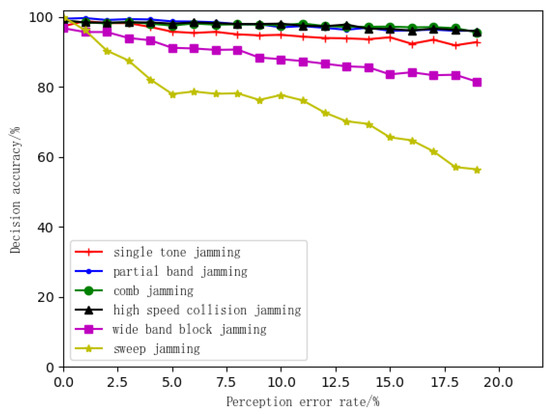 As seen from the results in Figure 6, the reliability of the decision-making algorithm is less affected by perception error when the jamming patterns have a narrow bandwidth and limited jamming frequency coverage characters (i.e., single-tone jamming, partial band jamming, comb jamming and high-speed collision jamming). It also confirmed that the proposed algorithm has good robustness.
