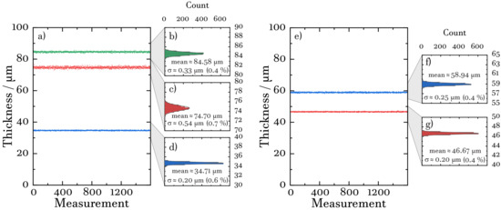 To demonstrate the stability of the measurement results, we recorded data at 1.6 kHz measurement rate with both the sample at rest and a stationary measurement head. Results for the metallic disk with three layers and the non-metallic one with two layers are shown in Figure 3a,e, respectively. Each plot comprises 1600 data points, equivalent to a sampling time of 1 s. Figure 3b–d as well as Figure 3f,g show the corresponding histograms of the layer thickness results. The bin width of the histograms is 0.2 µm. The standard deviations of the individual layer thicknesses range from 0.2 µm to 0.54 µm. Hence, even at this evaluation speed, the relative error remains well below 1% for all of the individual layers investigated here.
