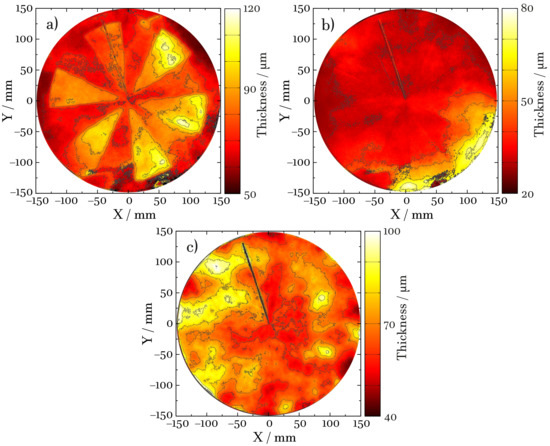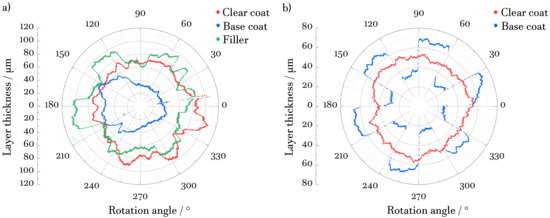 To demonstrate the repeatability of the layer thickness measurements, we present data acquired with rotating samples but stationary reflection head (fixed radius). The results of 10 consecutive turns are shown in Figure 4. The thicknesses of all layers fall in the range of about 30 µm to 100 µm. For each sample, the polar-coordinate plots of the thickness readings overlap perfectly, which illustrates the excellent repeatability of both the raw data and the evaluation results. In the plot of the metallic substrate disk (see Figure 4a), the slit of the disk, used for consistency checks of the image reconstruction, is seen at an angle of about 10 degrees. At an angle of 205 degrees, some deviating measurement results appear for the filler and basecoat, where the first one exhibits larger values around 110 µm and the latter one shows lower values around 30 µm. The pattern of the mask imprint is seen in the lowest layer of each sample, i.e., in the thickness of the filler in the case of the metallic substrate, and in the thickness of the base coat on the non-metallic substrate, the latter exhibiting a more pronounced and uniform thickness contrast (see Figure 4b). This is attributed to the improved hand-spraying skills that the experimentalist developed during the project.