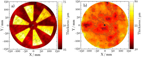 The samples consist of metallic (aluminum) and non-metallic (polycarbonate) disks, each with a diameter of 300 mm, that are spray-coated by hand so that multiple layers are added. An aluminum mask with six cutouts serves to imprint a predefined structure in one of the layers. To this end, the first layer on each sample is produced in two steps: First, a uniform layer is applied without any mask and then, after a short drying phase of approx. 10 min, a second layer of the same coating is added, now with the chopper-blade-like mask in place. These steps imprint a “negative” of the mask in the thickness of the first layer. This artificial feature in the thickness of the layer permits a visual consistency check of the thickness results.