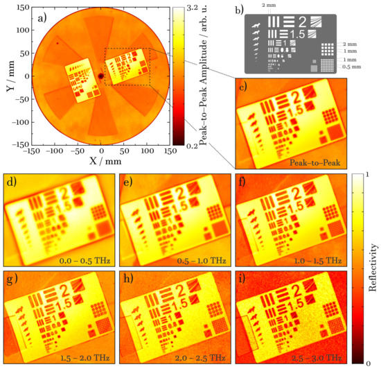 The peak-to-peak amplitude representation of the entire image is shown in Figure 7a. The sample layout is depicted in Figure 7b. An enlarged section of the peak-to-peak amplitude image can be seen in Figure 7c, where stripes down to 0.8 mm are still resolved in the intensity image. Figure 7d–i comprise representations of the reflectivity at individual frequency ranges from 0 to 3 THz, each range covering an interval of 0.5 THz width. As expected, the resolution improves at higher frequencies, whilst the dynamic range decreases concurrently. In Figure 7h,i, the 0.6 mm stripes are clearly seen and even the 0.4 mm stripes can be recognized.