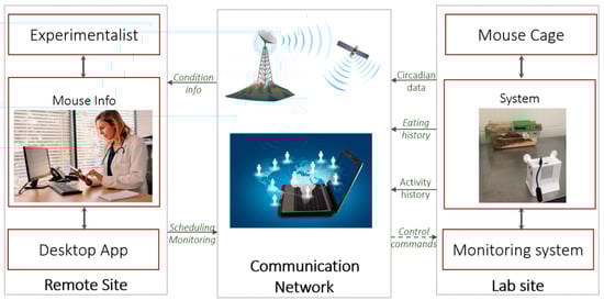 Figure 1 presents a schematic representation of CageView and the communication between its different subsystems. As shown in the figure, food access and animal activity data are transmitted from the laboratory location to the experimenter’s desktop application through the communication network. In parallel, the experimenter can send control commands to the laboratory location where the mouse cage is housed.