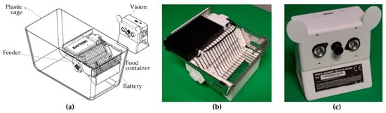 (a) Overall scheme of the apparatus that consists of the plastic frame, feeding mechanism, vision unit, food container, and power system. (b) Feeding mechanism and (c) vision unit mounted on and placed next to the mouse cage, respectively.