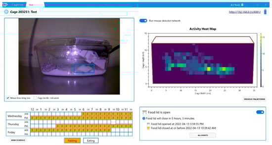Sample screenshot of the interface software of the desktop application showing the live stream of the cage, feeding and fasting schedule, mouse trajectory, history of the animal’s access to food, and the experimenter’s options to open or close the food access door.