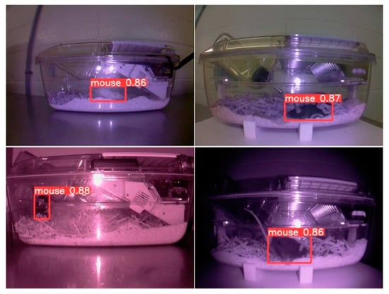 To collect a dataset covering various situations that the cage and the mice can shape, we captured images across numerous days with different cages and different mice with varying colors (white, black, and brown). We gathered images during all hours of the day to cover the different lighting conditions that the experiment environment might introduce. Overall, we collected a dataset of 27,735 images, where 24,398 images contained a mouse, and the bounding boxes were annotated manually. The 3337 images with no mouse were used as background images to help the training of the network.
