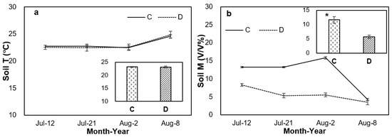 Dynamic variations of soil temperature (Soil T) on the 8 to 12 July to August in 2013, respectively. (a,b) are annual mean values (±SE). *, significant difference between the two treatments at the level p < 0.05. C: ambient precipitation; D: precipitation treatment; n = 6.