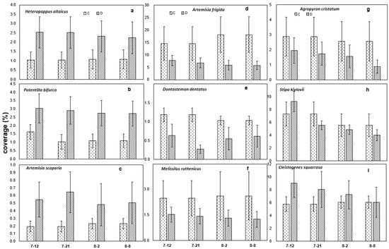 Effects of drought on coverage of Heteropappus altaicus (a), Potentilla bifurca (b), Artemisia scoparia (c), Artemisia frigida (d), Dontostemon dentatus (e), Melissilus ruthenicus (f), Agropyron cristatum (g), Stipa kiylovii (h), and Cleistogenes squarrosa (i). C: ambient precipitation; D: precipitation treatment; n = 6.