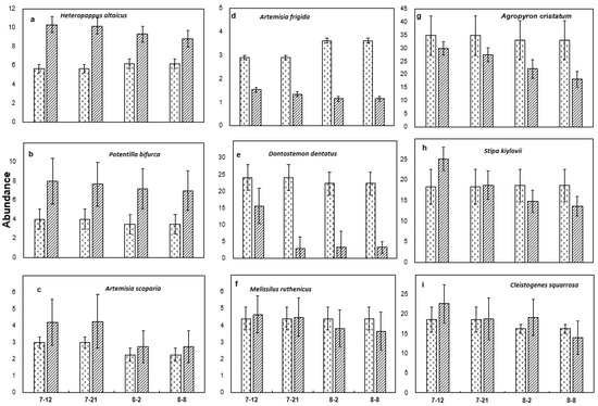 Effects of drought on abundance of Heteropappus altaicus (a), Potentilla bifurca (b), Artemisia scoparia (c), Artemisia frigida (d), Dontostemon dentatus (e), Melissilus ruthenicus (f), Agropyron cristatum (g), Stipa kiylovii (h), and Cleistogenes squarrosa (i). The column with grid and slash represents the control and drought treatment, respectively. See Figure 2 for abbreviations and graph information.