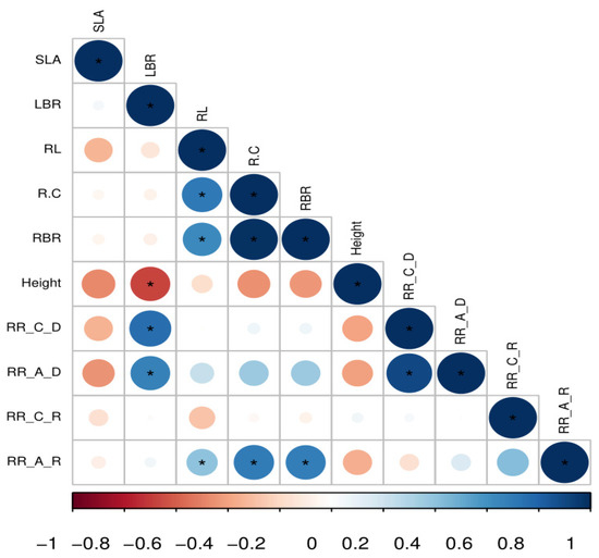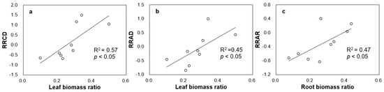 The response ratio of coverage to drought under the stress (RRCD) and the response of abundance to drought under the stress (RRAD) were significantly positively correlated with leaf biomass ratio (LBR, Figure 4). The response ratio of abundance to drought in the recovery stage (RRAR) was significantly positively correlated with root length (RL, Figure 4), root shoot ratio (RC, Figure 4), and root biomass ratio (RBR, Figure 4). The LBR was significantly negatively correlated with height (Figure 4). The RBR was significantly positively correlated with RL and RC (Figure 4). RL was significantly positively correlated with RC (Figure 4). RRAD was significantly positively correlated with RRAD (Figure 4). RRCD (R2 = 0.57, p < 0.05; Figure 5a) and RRAD (R2 = 0.45, p < 0.05; Figure 5b) in the experimental plots increased linearly with leaf biomass ratio during the drought treatment. In addition, the RRAR also enhanced linearly with root biomass ratio (R2 = 0.47, p < 0.05, Figure 5c) during the recovery stage.