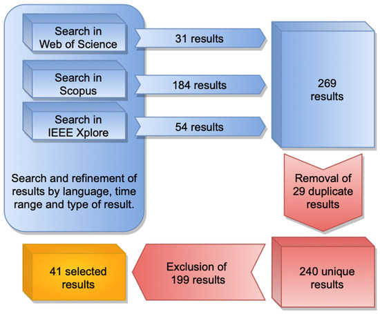 The search was carried out on three different web platforms: Web of Science, Scopus, and IEEE Xplore. In each of these web platforms, the search was performed using a specific search inquiry for each of them (Table 3) based on the structure defined in Table 1. Note that the Web of Science search was carried out through all the databases available on this platform. This search was conducted on 24 July 2021, and the results obtained were refined by language (all works written in a language other than English were discarded), by time range (all works published before the year 2010 were discarded), and by type of result (all results that were not articles, proceedings papers, reviews or book chapters were discarded). The number of documents obtained in this manner was 269, of which 31 corresponded to Web of Science, 184 to Scopus, and 54 to IEEE Xplore. Subsequently, from this set of results (269) duplicate results (29) were eliminated, leaving 240 unique results. Each of these 240 documents was analyzed individually (through its abstract or its abstract and full text together) to determine its eligibility, discarding those that did not relate the use of VR, AR, or MR with MSE. In this way, 41 works were selected, which were subsequently analyzed in detail and described in this work. The job search and selection process are outlined in Figure 1.