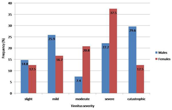 Frequency of tinnitus severity levels in males (blue) and females (red).