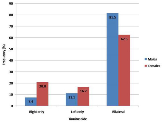In most of the cases tinnitus involved both sides (right and left) (72.5% in the combined sample) (Figure 2). No significant differences were found in tinnitus side appearance between the genders (p = 0.112). Additionally, no significant difference was found between the severity levels of tinnitus and its uni/bilateral appearance (p = 0.929).