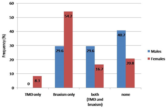 About 2/3 of the studied sample (66.7%) was diagnosed with bruxism, while TMD was found in 27.5% of the cases (Table 1). No significant differences were found in bruxism and TMD prevalence between the genders (p > 0.234) (Table 1). The majority of TMD cases (92.8%) were also diagnosed with bruxism. Only 31.4% of the whole sample (20.8% of females, 40.7% of males) were not diagnosed with TMD and bruxism (Figure 3).