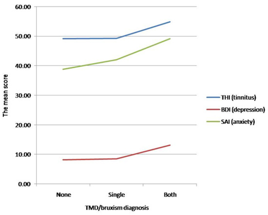 THI, BDI and SAI scores were compared between three groups of the patients classified according to their diagnosis with tinnitus only, tinnitus and either TMD or bruxism, tinnitus and both TMD and bruxism. Significant difference was found in SAI scores between the groups (p = 0.045) (Table 2). Patients diagnosed with tinnitus and both TMD and bruxism had significantly higher SAI score (mean = 49.17) compared with patients having only tinnitus (mean = 38.75) (p = 0.037, Post Hoc analysis). No statistically significant difference was found in THI and BDI scores between the three of the groups (p > 0.260) (Table 2). Yet, there was a tendency for all of the studied scores to increase with increased number of TMD/bruxism diagnoses, namely, the tinnitus only group scored the lowest, tinnitus combined with both TMD and bruxism scored the highest (Figure 4). This was especially evident regarding the THI score and the SAI score.