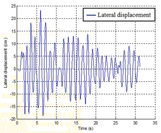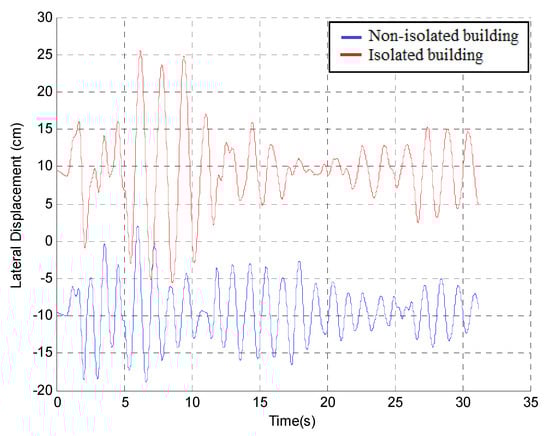 In the next stage of the investigation, the dynamic response of two models of buildings (non-isolated and isolated) was investigated. The results of the analysis are graphically presented in Figure 3 in the form of time history displacements. As can be seen from the figure, providing the isolation system in the base level of one of the buildings resulted in an increase in displacements, and some collisions could be observed. The value of the peak lateral displacement of the top of the isolated building strictly depends on the value of the base lateral displacement during seismic excitation. The peak value of lateral displacement for the isolated building was estimated to be equal to 17.14 cm, which represents a difference between the top and base levels of the model equal to 6.76 cm.