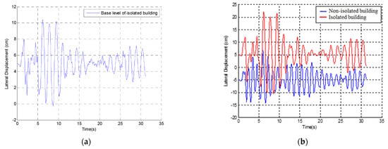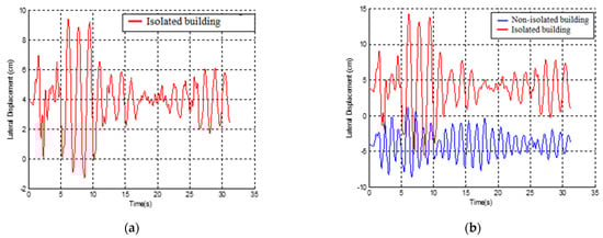Lateral displacement time histories of a non-isolated building and an isolated one: (a) base level; (b) top level.