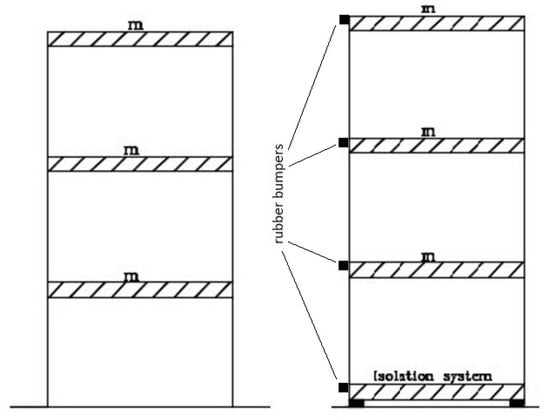 The phenomenon of earthquake-induced structural pounding is described on the basis of impacts between bridge segments, or buildings, when they are located close to each other without any critical distance [1,2,3,4,5,6]. The presence of large relative displacements between neighboring structures during ground motions may result in dangerous collisions leading to serious damage [7,8,9,10,11]. To avoid such situations, consideration should be directed towards ensuring an appropriate minimum distance between adjacent structures as well as to adjusting the properties of the buildings. The most natural approach (the easiest from an engineering point of view) is to increase the size of the gap between the buildings, or to fill it using viscoelastic materials (see [12,13]). Several studies have focused on different methods for estimating gap sizes that will be sufficient to prevent earthquake-induced structural pounding [14,15,16]. However, providing a sufficient separation distance is not always possible due to the cost of land, which results in the use of the maximum possible area in metropolitan cities. Therefore, methods for controlling structural displacement are often considered as an alternative solution for preventing collisions between buildings during earthquakes. However, from the engineering point of view, these methods can be difficult to be implemented in practice. Anagnostopolos and Karamaneas [17] and Barros and Khatami [18] considered the effectiveness of concrete shear walls for increasing the stiffness of the structures, thereby minimizing the gap size between adjacent buildings. Zhang and Xu [19] and Matsagar and Jangid [20] studied different types of links between neighboring buildings by using spring and dashpot elements in order to improve the structural dynamic behavior. Connections between adjacent structures with the use of stiff additional beams were also considered by Westermo [21]. He used a special link element that was able to dissipate energy and prevent collisions during ground motions. Kasai et al. [22] eliminated pounding effects by applying viscoelastic dampers installed between two adjacent buildings. Another work in which the application of viscoelastic dampers was analyzed was performed by Kazemi et al. [23]. The effect of rubber bumpers was also studied by Panayiotis et al. [24], Polycarpou et al. [25] and Abdel Raheem [26]. Sołtysik et al. [27] used polymer elements to reduce negative pounding effects during earthquakes. Dogrul [28], Braz and Barros [29], and Garcia [30,31] investigated the nonlinear behavior of structures with the aim of decreasing lateral structural displacements using passive dampers.