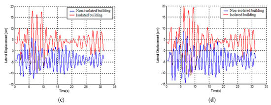 Lateral displacement time histories of non-isolated and the isolated buildings with an 8 cm size gap: (a) base level; (b) first story; (c) second story; (d) third story.