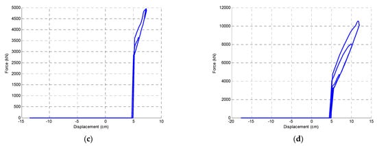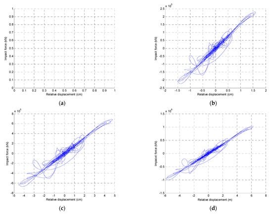 The hysteresis loops of the rubber bumpers during impact, when the base level exceeds a relative displacement of 5 cm, are shown in Figure 11. The results indicate that the energy was absorbed by bumpers in order to control the lateral displacement of all stories. The peak values of the forces induced in bumpers were equal to: 15.55 × 103 kN, 8.15 × 103 kN, 4.85 × 103 kN and 10.40 × 103 kN for the Parkfield, Kobe, San Fernando and Tabas earthquakes, respectively. As can be clearly seen, impact occurred after the critical distance (5 cm) and energy had dissipated, as depicted by the hysteresis loops in Figure 11.